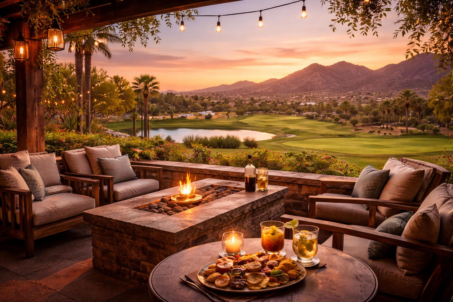 Upscale outdoor bar at The Westin Kierland overlooking the golf course, serving craft cocktails, light bites, and a relaxed refined desert atmosphere.